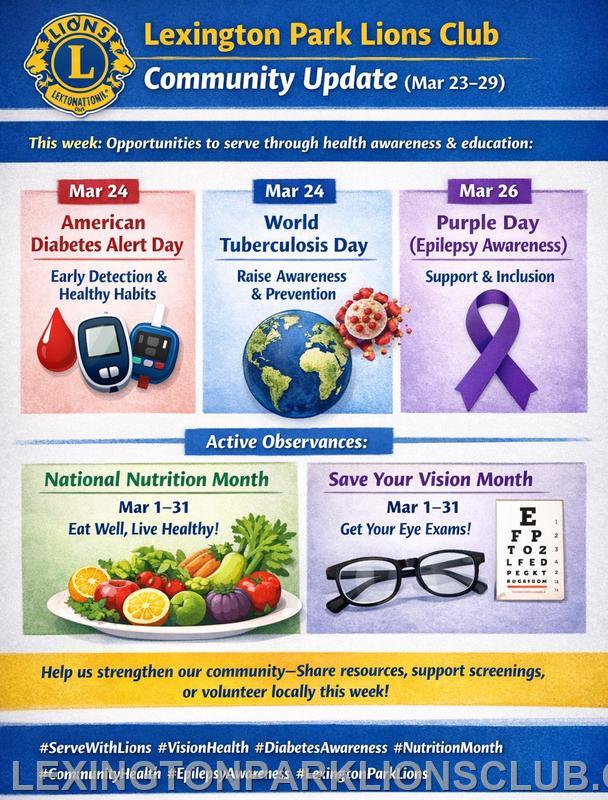 | The Lexington Park Lions Club is using the week of March 23–29 to highlight several important health observances that remind us how local service can make a real difference in people’s lives. With American Diabetes Alert Day, World Tuberculosis Day, and Purple Day for Epilepsy Awareness all taking place this week, Lions are encouraging neighbors to learn more, share helpful resources, and support healthier communities through education and outreach.