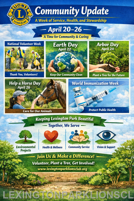 | The week of April 20–26 offers several meaningful reminders of how everyday service can strengthen a community. For the Lexington Park Lions Club, this is a time to focus on caring for our environment, supporting public health, and recognizing the volunteers whose efforts make local service possible. From Earth Day and Arbor Day to National Help a Horse Day, this week highlights the many ways individuals and families can make a positive difference close to home.