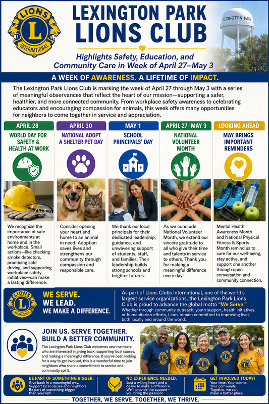 | The Lexington Park Lions Club is marking the week of April 27 through May 3 with a series of meaningful observances that reflect the heart of our mission—supporting a safer, healthier, and more connected community. From workplace safety awareness to celebrating educators and encouraging compassion for animals, this week offers many opportunities for neighbors to come together in service and appreciation.
